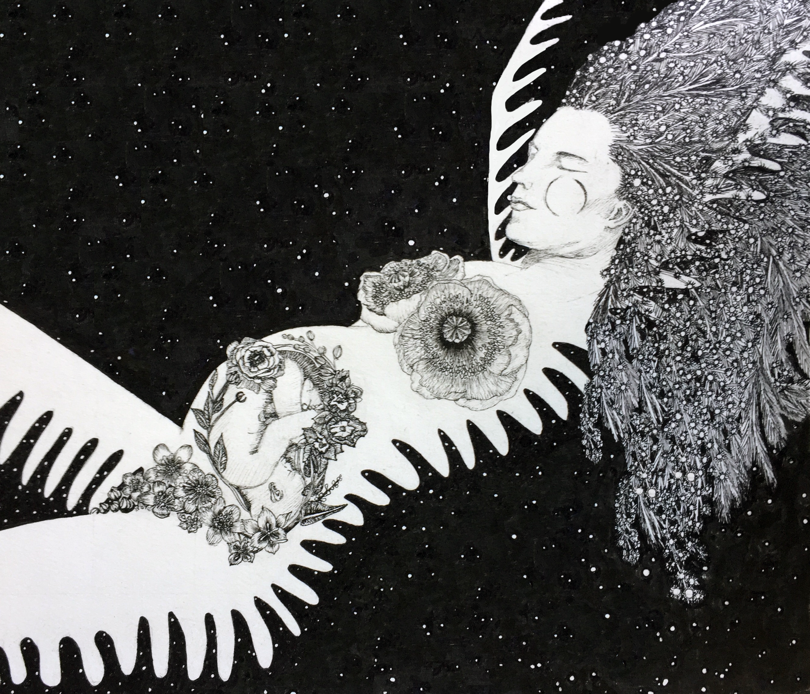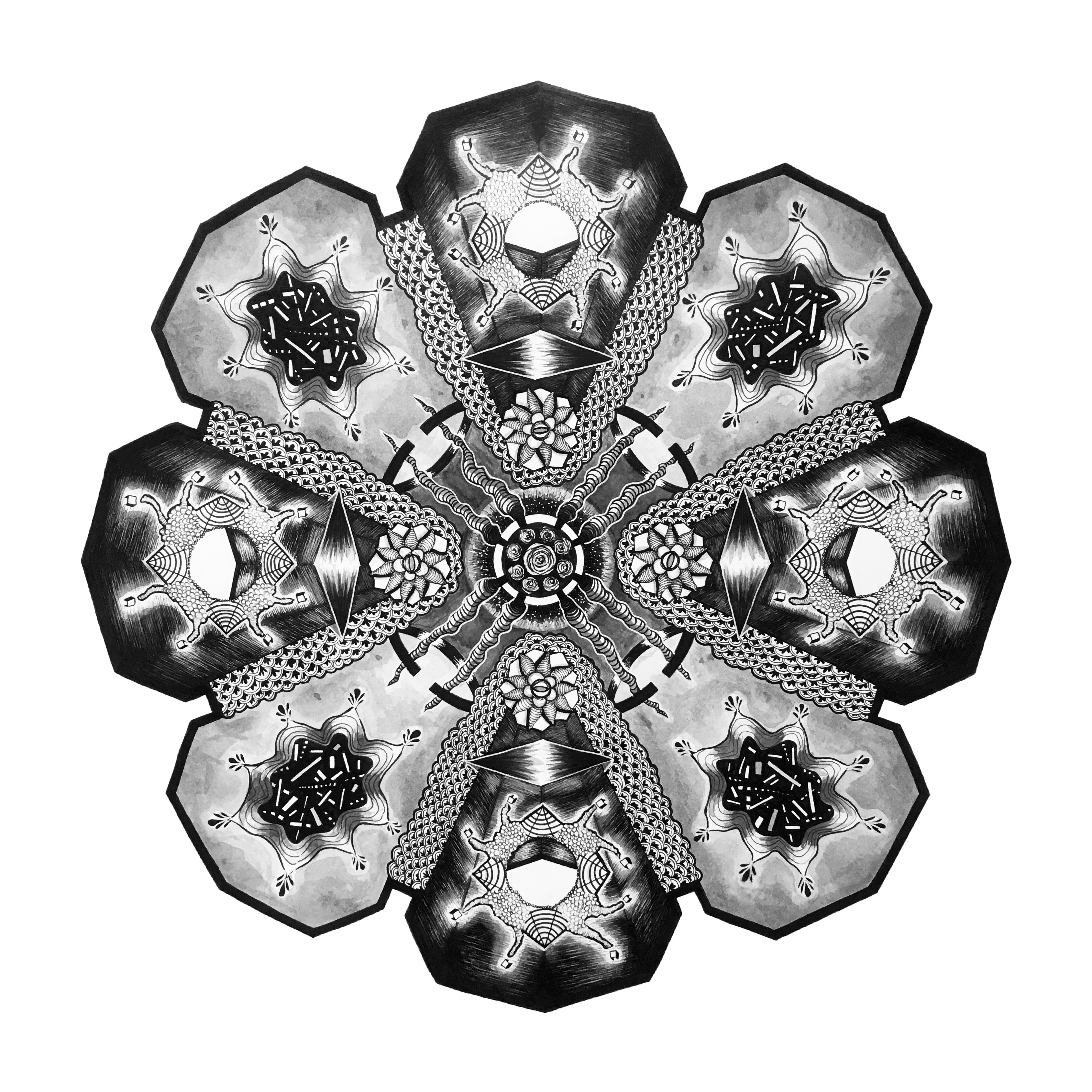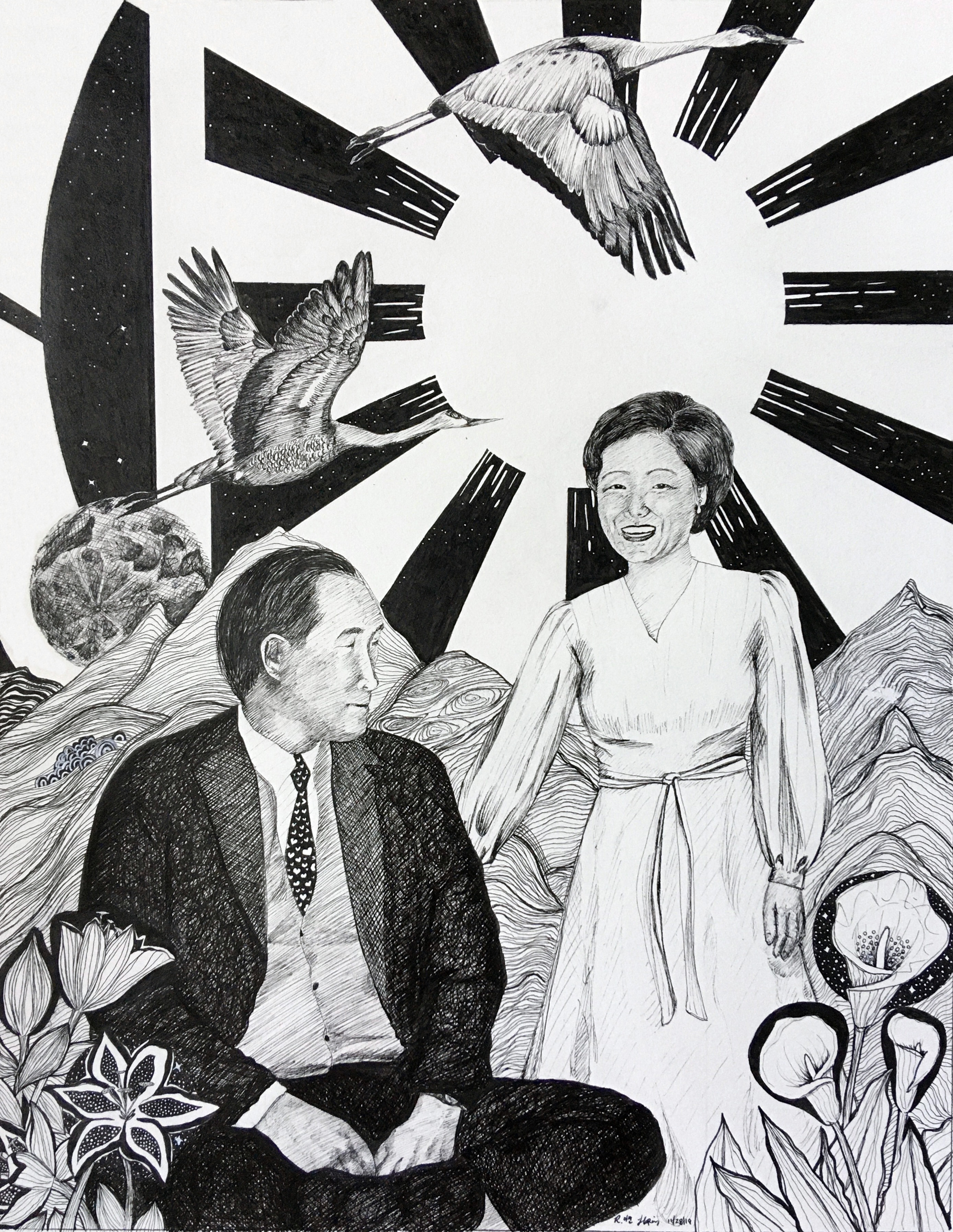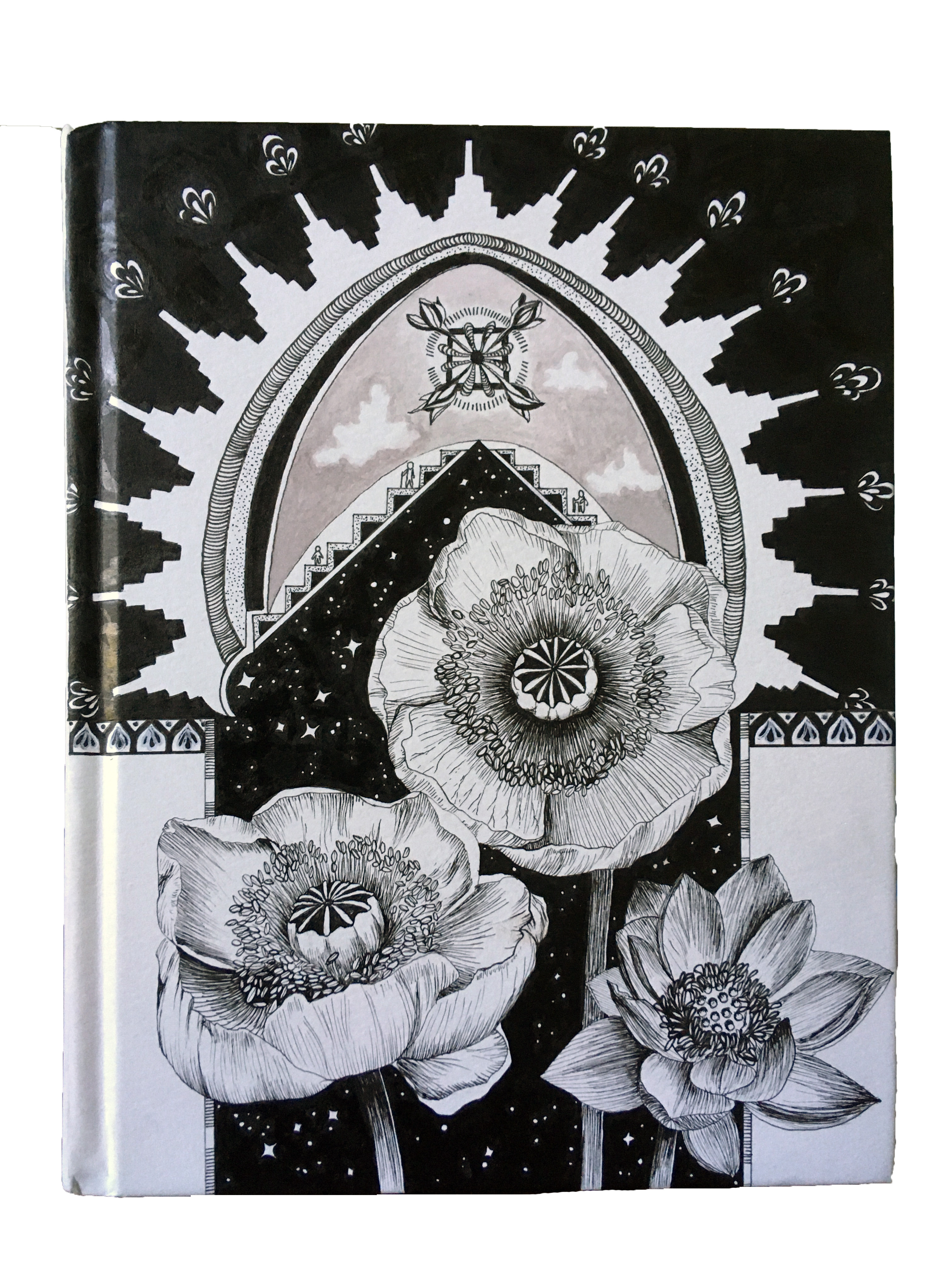 An art magazine dedicated to art without color. The cover, table of contents spread, and article spread contain original illustrations. Contents of the magazine are geared toward those who appreciate different forms of art. The illustrations are of poppy flowers and a lotus flower drawn with micron pens.