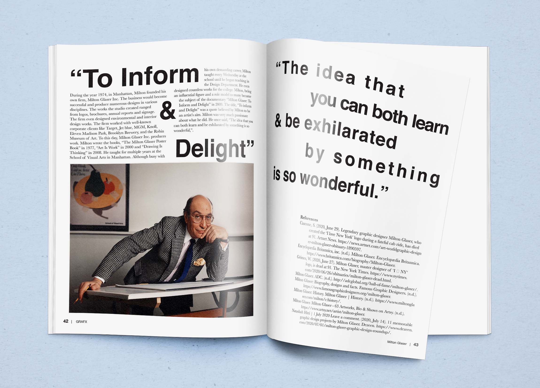 Magazine spreads dedicated to Milton Glaser’s life and his work as a Graphic Designer. The spread designs and colors are inspired by Milton Glaser’s work.